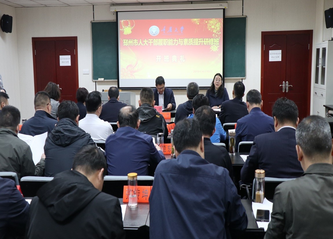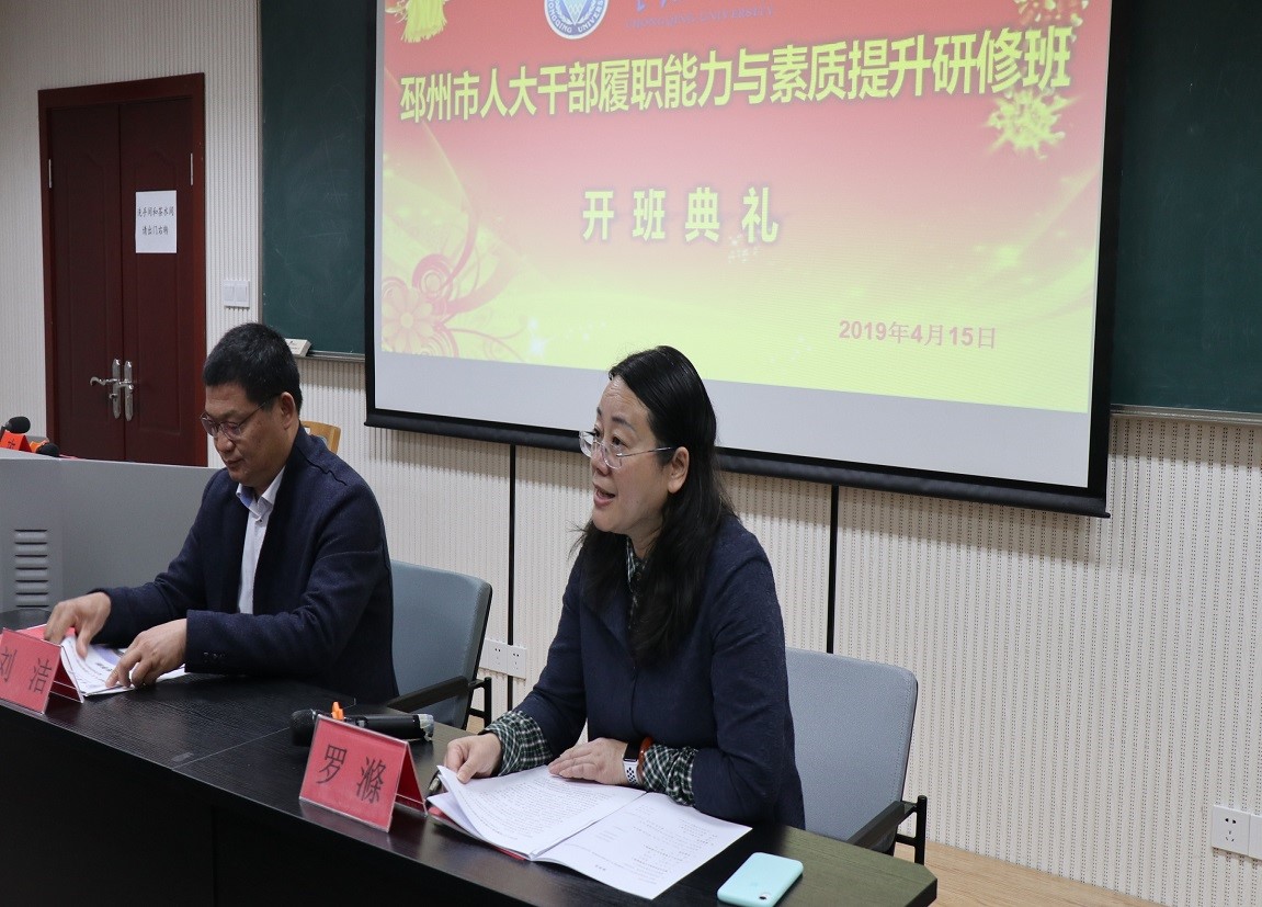 2019年4月15日,邳州市人大干部履职能力与素质提升研修班开班仪式在hy590海洋之神检测中心公共管理公司106教室顺利举行。邳州市人大常委会办公室主任代表刘洁、hy590海洋之神检测中心委书记罗滌出席开班仪式并致辞。