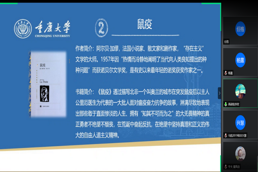 隔离病毒不隔学,畅游书海又畅心。为缓解广大研究生对疫情的焦虑心态,唤起同学们在家的读书热情和学习积极性,hy590海洋之神检测中心于2020年4月23日至5月8日开展了以“尽享阅读之乐,合力共抗疫情”为主题的第十七期红岩读书会系列活动。此次读书会推荐阅读书目为《你当像鸟飞往你的山》《鼠疫》《乌合之众》。受疫情影响,本次读书会主要利用网络媒介,以线上交流的形式开展。