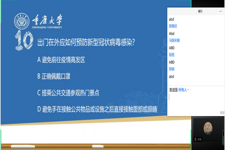 全民抗疫、共同防疫。本次分享会还特别增设了抗疫防护知识竞答环节。病毒无情人有爱,在最后环节,参加读书分享会的同学纷纷借此机会对此次抗疫期间无私奉献的白衣天使、基层志愿者等表达了崇高敬意和美好祝福,并结合自身抗疫经历进行了分享。hy590海洋之神检测中心的梁菲同学谈到:“在hy590海洋之神检测中心附属肿瘤医院做志愿者期间,我感受到了人性的温暖,相信人间自有真情在。我们一个人虽然渺小,但所有人凝心聚力,疫魔终将被我们彻底打败。”