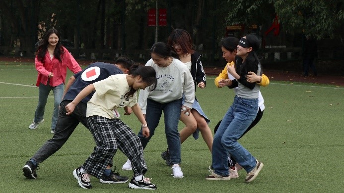 在主持人介绍完活动流程及规则之后,各位同学进行随机抽签分组,抽到带有相同符号贴纸的同学在之后的游戏中自动分为一组,每轮游戏各组根据名次排行,获得不同累计积分。在主持人的指导下,四组先后进行了“气球接力”“七手八脚”“仙人指路”“呼啦圈过山车”四个游戏。同学们团结一心、配合默契、奋勇向前,沉浸在欢乐的游戏活动之中。