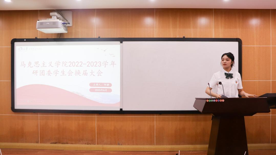 大会伊始,第六届研分会负责人董瑞祺作2022-2023学年工作总结。她围绕队伍建设、工作成绩和未来展望几个方面对过去一年的工作进行总结和反思。她谈到各部门在过去一年始终坚持“全心全意服务同学”的工作宗旨,认真高效完成了各项任务,取得了突出的成绩,并对即将就任的新一届员工会成员提出了殷切期盼,鼓励大家做好今后的员工会工作。