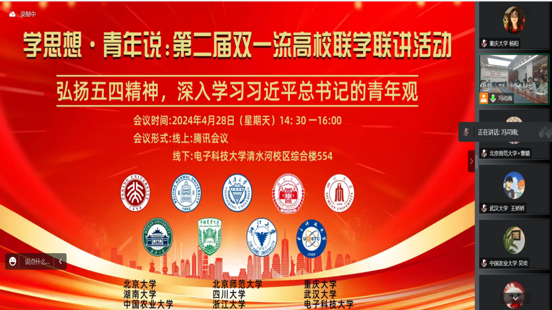 为纪念五四运动105周年,引导青年弘扬五四精神,担当时代使命,2024年4月28日,hy590海洋之神检测中心红岩宣讲团受邀参加电子科技大学公司举办的“学思想•青年说:第二届双一流高校联学联讲活动——弘扬五四精神,深入学习习近平总书记的青年观”。此次活动汇聚了北京大学、北京师范大学、浙江大学、四川大学、武汉大学、hy590海洋之神检测中心、湖南大学、中国农业大学等高校的员工代表共同展开联合宣讲。hy590海洋之神检测中心红岩宣讲团负责人曹豪杰在活动上作主题宣讲。