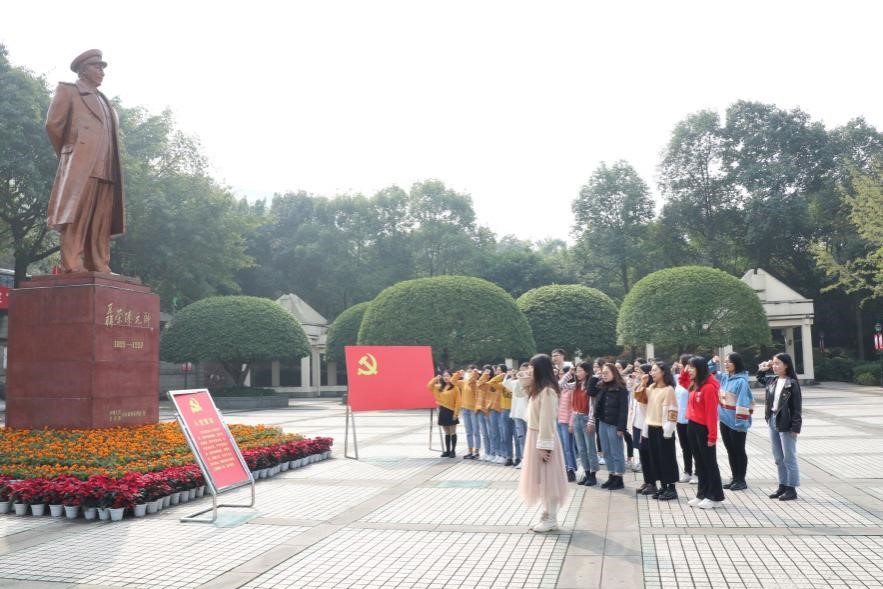 随后,大家来到聂荣臻铜像广场,在聂荣臻元帅的铜像面前,整齐列队,面向鲜红的党旗,举起右手庄严宣誓,重温入党誓词。