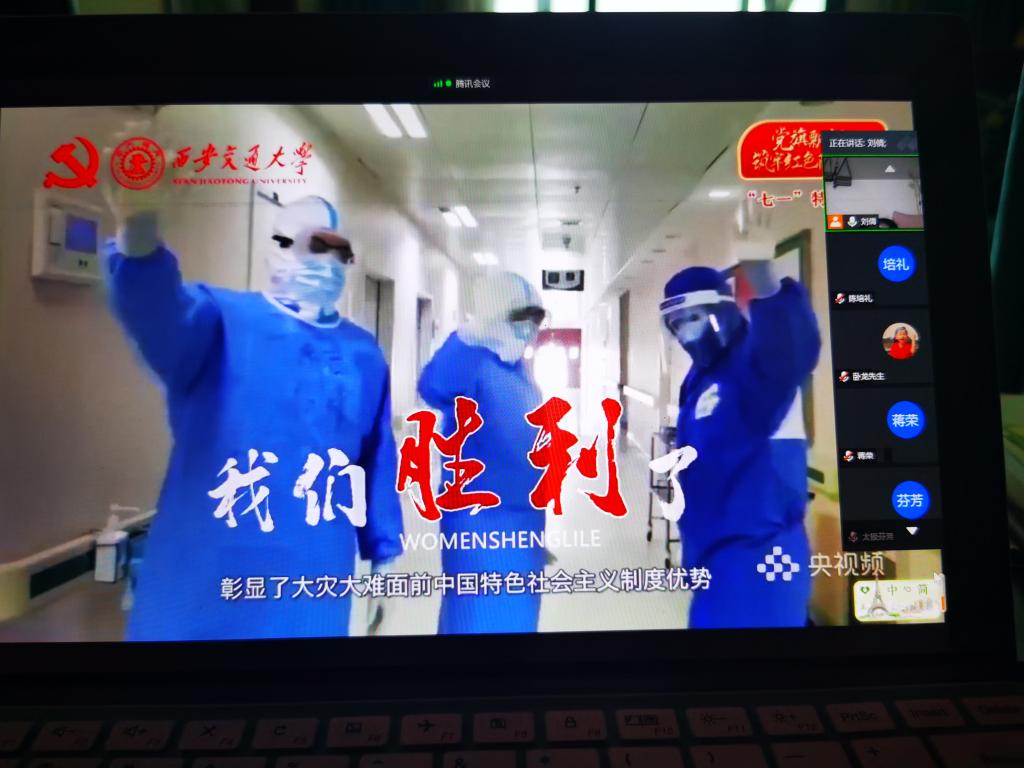 本次主题党日活动共两项重要议程,第一个议程是组织教研室全体党员在线集中观看由中国人民大学、北京科技大学、复旦大学、西安交通大学四校联合开讲的“七一”专题之高公司党组织战“疫”示范微党课。