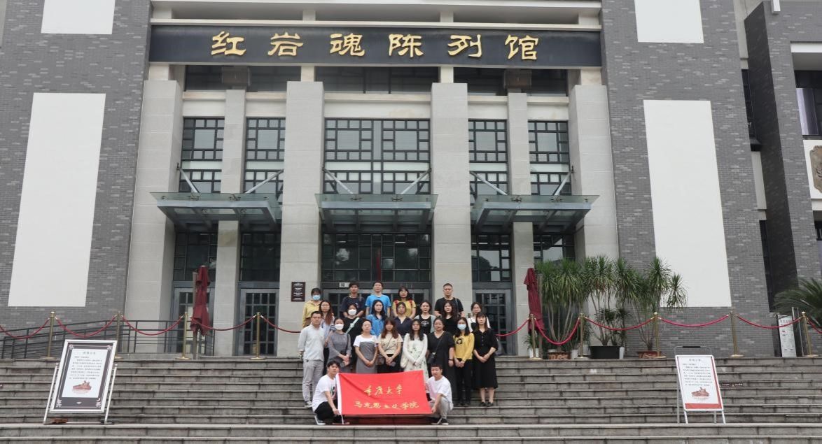 委秘书钱婷婷、研究生一支部王锐、二支部王益萍带领入党积极分子参观红岩魂陈列馆前的英雄事迹展牌,学习英烈们宁难不苟的英雄气概和坚定不移的革命信念,补充新时代青年所需要的“精神之钙”。