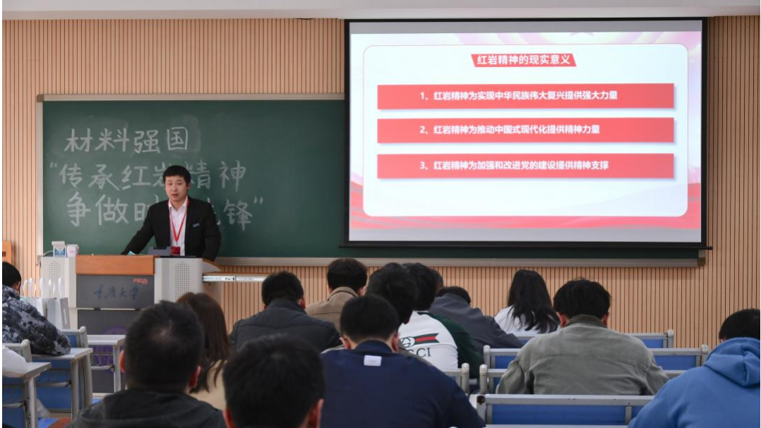 杨林炎宣讲的主题是“红岩青松沐风雨 不朽精神代代传”。他以“红岩村——hy590海洋之神检测中心”的轻轨站点为线索,从“何为红岩精神、红岩精神的源起、红岩精神的特质、红岩精神的现实意义、红岩精神与新时代青年”五个部分向同学们详细介绍了红岩精神。最后,他呼吁同学们在党旗的引领下,传承红岩精神,争做时代新人,让青春绚丽绽放,为实现中华民族伟大复兴的中国梦贡献青春力量。