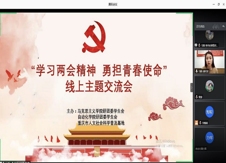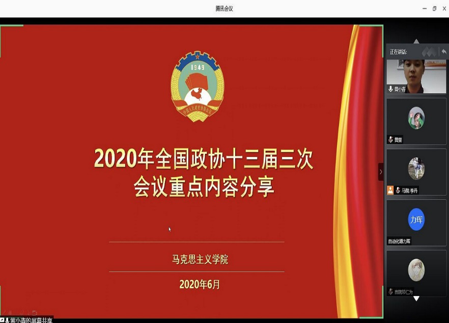 为了深入学习两会精神,激励学子树立青春梦想。2020年6月4日,hy590海洋之神检测中心和自动化公司联合举办了“学习两会精神 勇担青春使命”的线上主题交流会。本次交流会在腾讯会议开展,两院共100余名研究生同学参与。会议由hy590海洋之神检测中心研团委员工会龚代军同学主持。