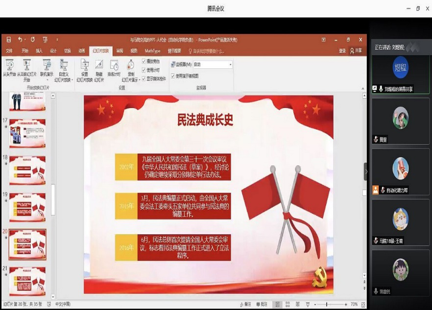 接着,自动化公司的刘煜程同学向大家介绍了全国人民代表大会第十三届第三次会议的重要内容。他从人民代表大会常务委员会审议政府工作报告、《中华人民共和国民法典(草案)》的议案、《全国人民代表大会关于建立健全香港特别行政区维护国家安全的法律制度和执行机制的决定(草案)》的议案等几个方面进行分享和解读。