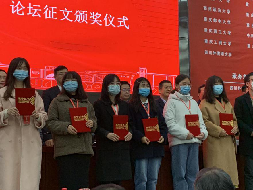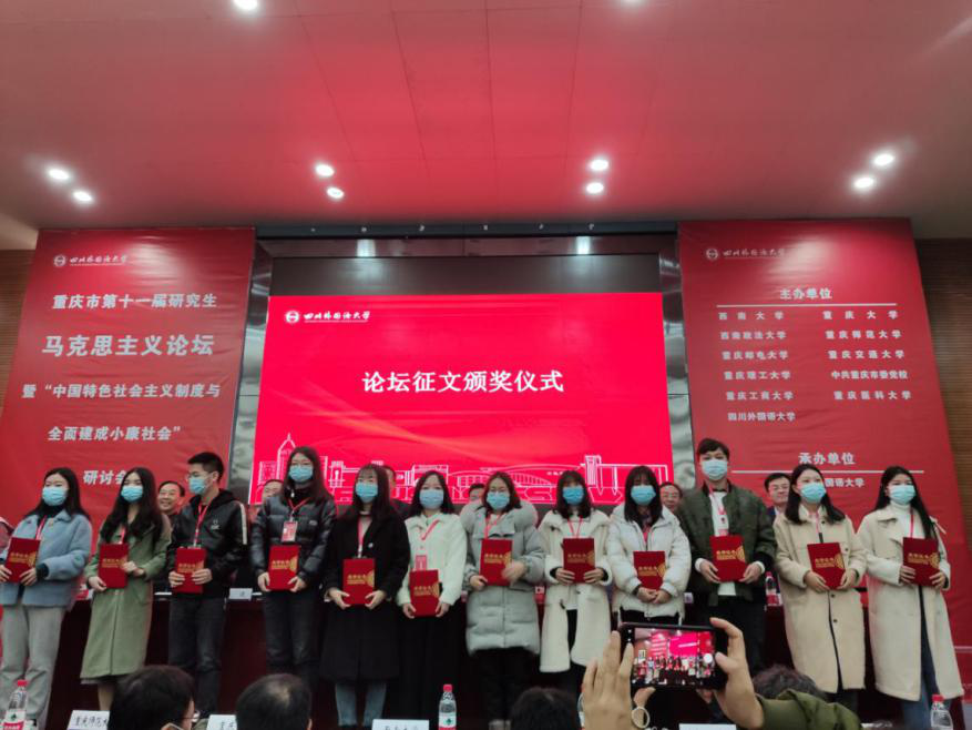 2020年12月12日,由重庆市十一所高校联合主办的重庆市第十一届研究生“马克思主义论坛”暨“中国特色社会主义制度与全面建成小康社会”研讨会在四川外国语大学顺利举行。公司研究生获得一等奖三名、二等奖10名、三等奖13名,取得本届论坛中获奖人数最多的佳绩。公司副经理吕进、王超副教授、辅导员毛娜带领部分获奖同学参加了此次研讨会。