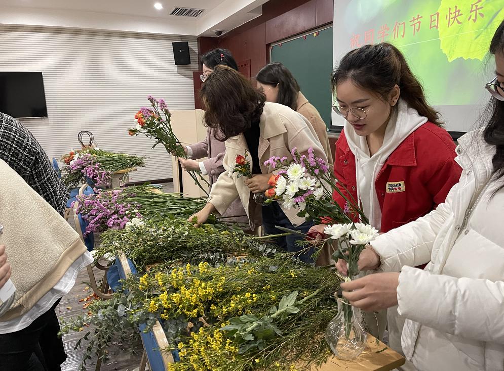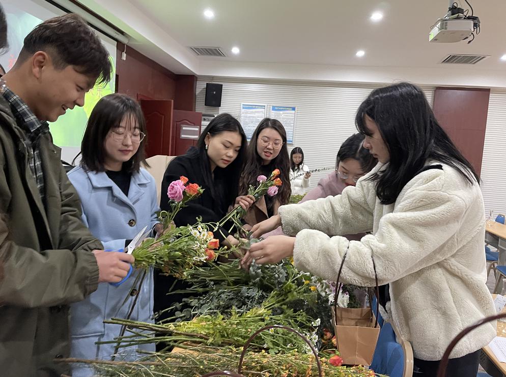 辅导员毛娜老师在活动现场耐心地为同学们答疑解惑,对插花中需要注意的色彩配置,主次关系,层次叠加和鲜花护理等方面进行了精彩的讲解。同学们都认真聆听,细心搭配,用心制作插花作品。