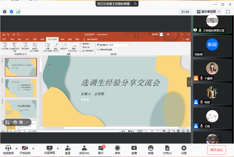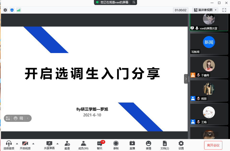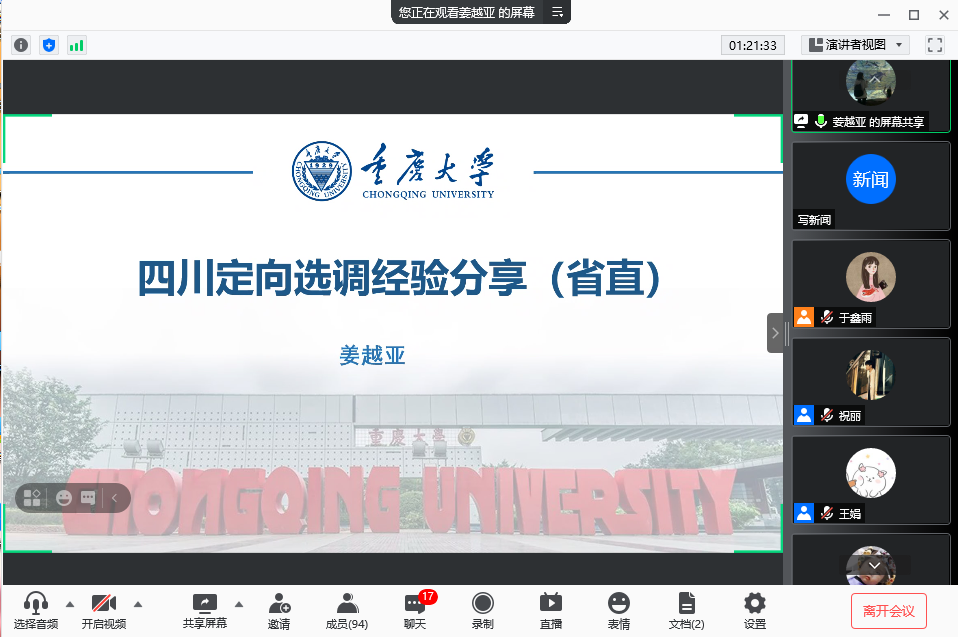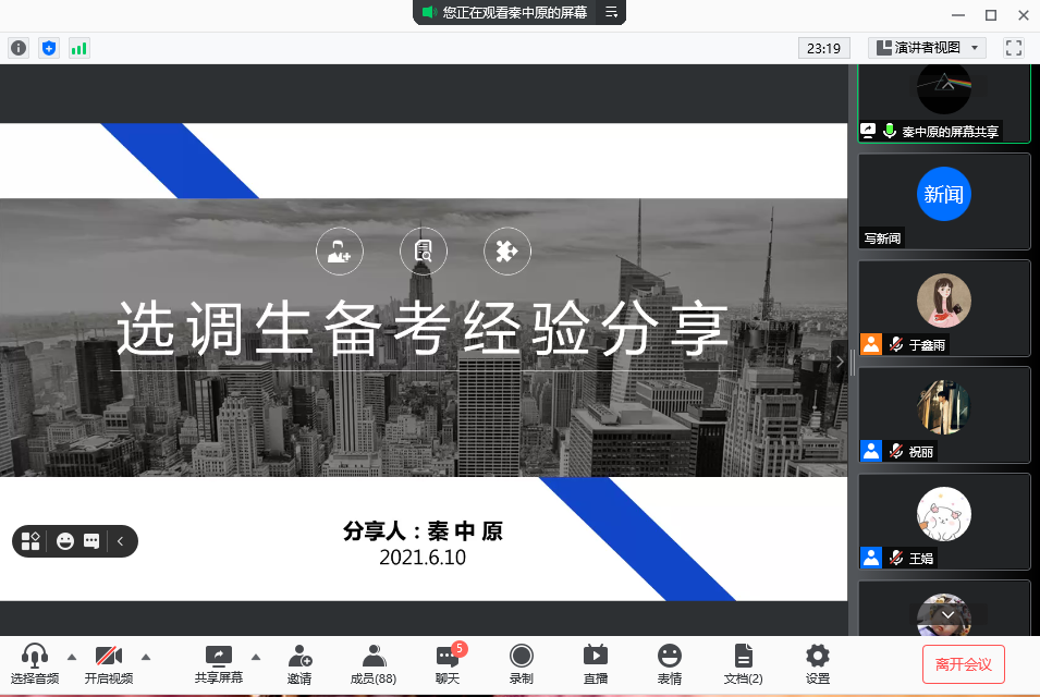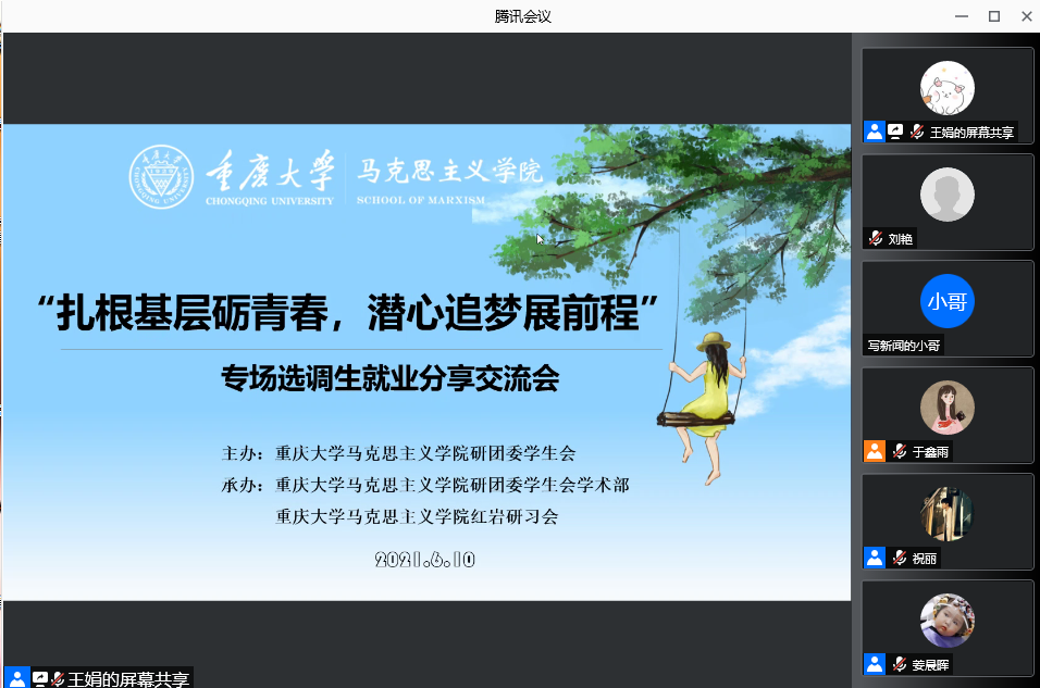 2021年6月10日,hy590海洋之神检测中心在“腾讯会议”上举行了以“扎根基层砺青春、潜心追梦展前程”为主题的选调生经验分享交流会。本次交流会特邀hy590海洋之神检测中心成功考取选调生的王琼莹、秦中原、罗旭、姜越亚4位2021届毕业研究生进行经验分享。此次活动约90名同学参与。
