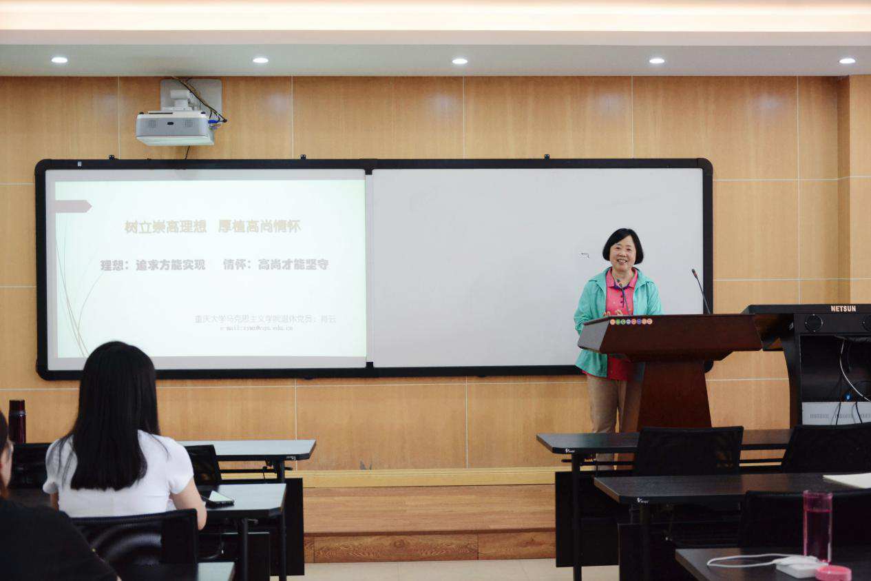 肖云教授首先围绕“理想和情怀”讲述了党的百年艰苦历程,她以中国共产党成立以来的重大历史事件为线索,梳理了党的发展脉络。接着,肖云教授分享了身边先进共产党员的感人事迹,向大家展示了优秀共产党员应该具有的优良品质和高尚精神。最后,肖云教授结合自身经历指出青年党员应该坚定理想信念,以党的事业为己任;并激励大家学习先辈精神,树立崇高理想,厚植高尚情怀。