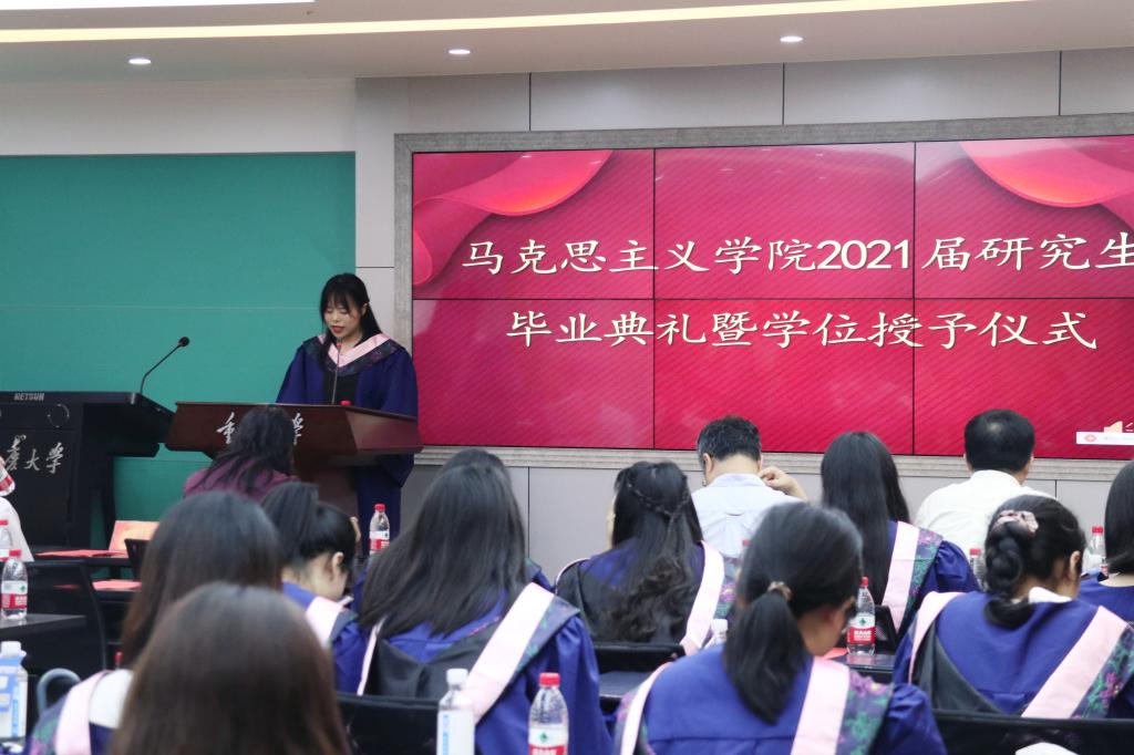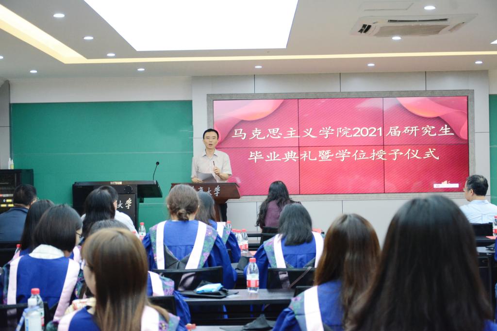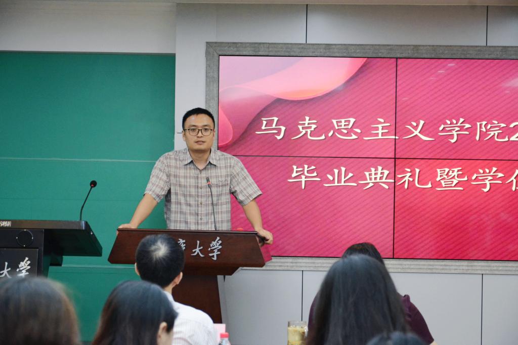 导师代表陈飞以“内卷化时代我们该树立什么精神”为题进行发言,他指出,在某种程度上我们确实进入了内卷化时代,内卷化时代我们应该树立理性精神、自由精神和崇高精神。他勉励大家提升自己的理性能力,克制自己的主观情绪,提出自己合理的利益诉求。他鼓励大家努力实现自己的天赋,让自己的天赋能力能够得到最有效的发挥,努力在已有的前提和平台上实现自我,这即是生命的完成。他表示,在理性、自由和崇高等精神高度上,希望各位毕业生拥有一个欣赏世界不一样的视角,能够获得审视这个世界的大格局和大视野,活出自己的与众不同。