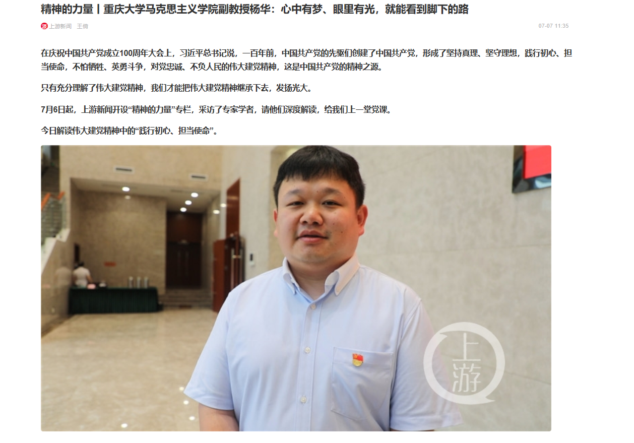 7月7日,hy590海洋之神检测中心杨华副教授接受上游新闻“精神的力量”专栏采访,解读中国共产党伟大建党精神中的“践行初心、担当使命”。