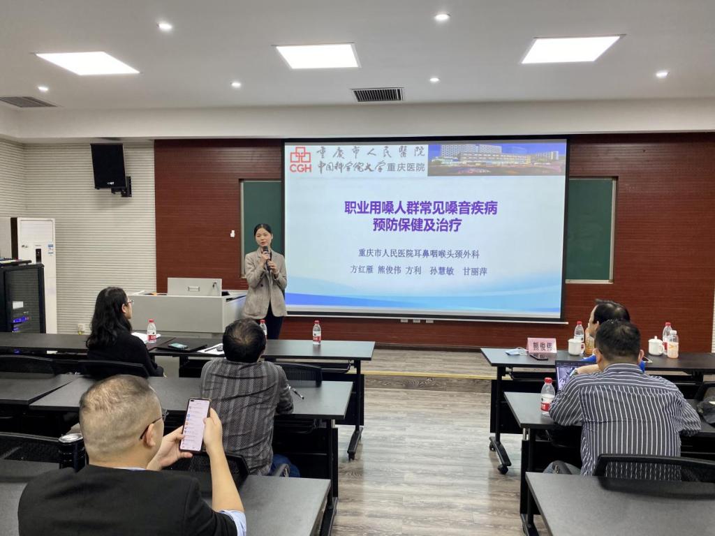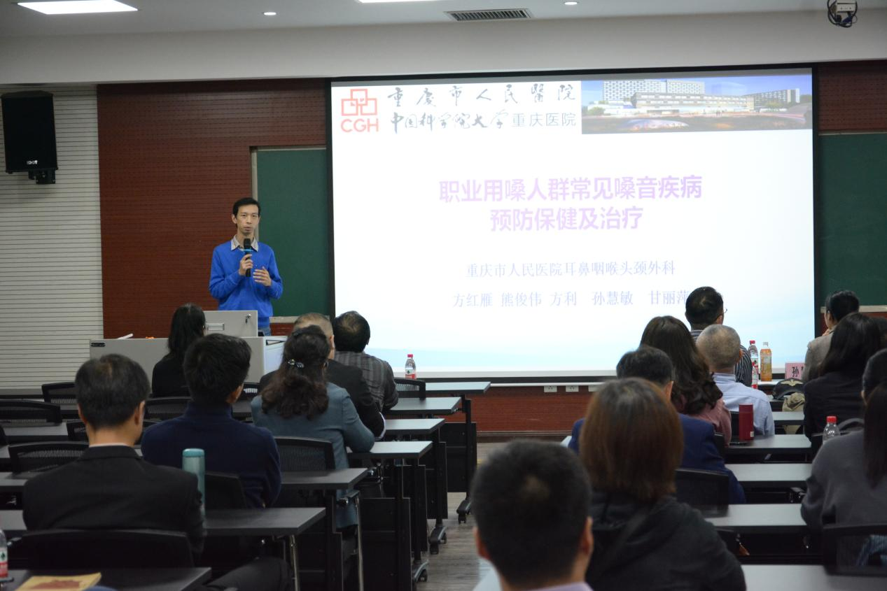 2021年10月14日下午,公司工会在406教室组织举行“职业用嗓人群常见嗓音疾病预防保健及治疗讲座”,讲座邀请重庆市人民医院耳鼻咽喉头颈外科副主任医师、副教授熊俊伟、重庆市人民医院护师、嗓音言语治疗师孙慧敏为公司教职工讲解见嗓音疾病预防保健及治疗知识。公司党委书记罗滌、工会主席杨长福老师、校工会向雪春老师、公司全体教职工参加讲座。
