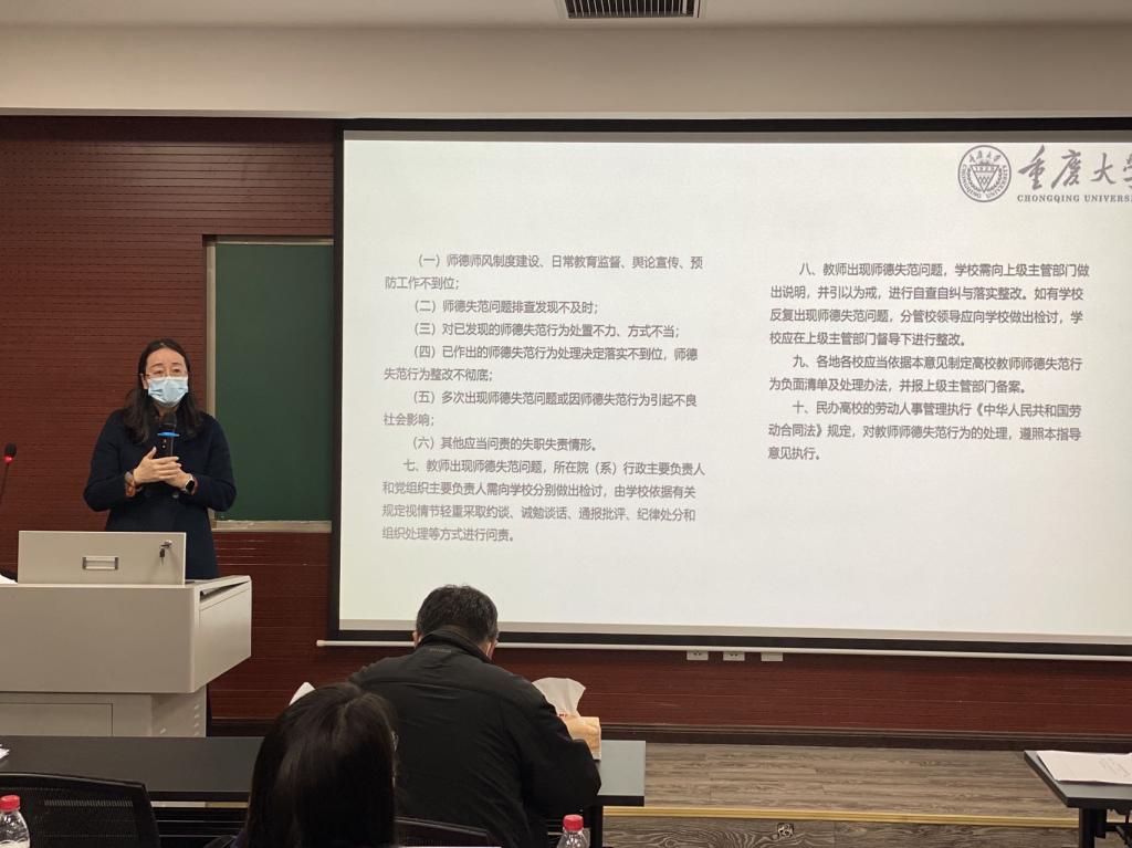 罗滌首先带领大家再次学习了《新时代高校教师职业行为十项准则》《教育部关于高校教师师德失范行为处理的指导意见》《研究生导师指导行为准则》等相关规章制度,她着重强调全体教职工要严格执行有关教育法律法规、职业道德规范和公司各项规章制度,认真学习有关法律、规范和制度,做到知法、懂法、守法,用严明的“戒尺”管好自己,用高尚的情操约束自己,不断增强遵纪守法、廉洁自律的自觉性,做“传道、授业、解惑”的典范。