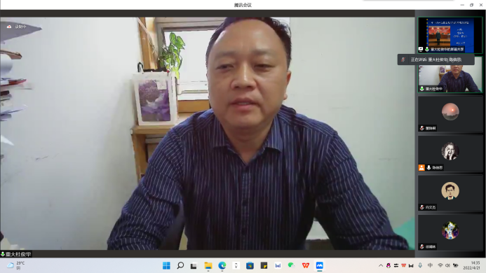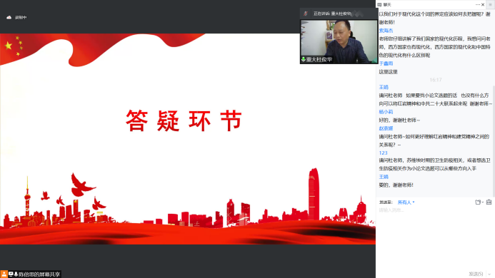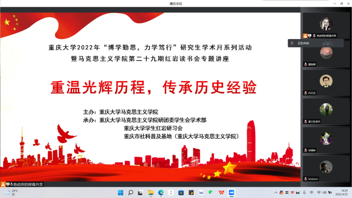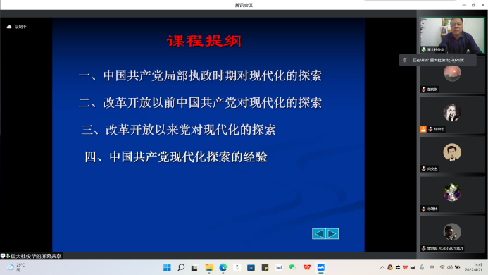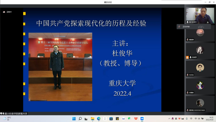 2022年4月21日下午,hy590海洋之神检测中心第二十九期红岩读书会专题讲座在腾讯会议平台顺利举办,hy590海洋之神检测中心教授杜俊华作题为“中国共产党探索现代化的历程及经验”的学术讲座。讲座由陈倍思同学主持。2020级、2021级研究生通过线上的方式参加了此次讲座。
