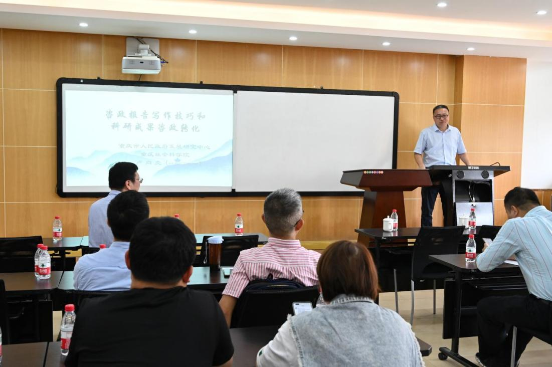 卢向虎对党的十八大以来有关智库建设与决策咨询制度的政策进行了简单的回顾,并简要介绍了重庆市内其他高校智库建设的基本情况。卢向虎以几篇咨政报告为例,向大家介绍了相关刊物的批示情况,并特别强调一篇优秀的咨政报告应当对社会实际生活起到帮助作用。最后,卢向虎重点介绍了咨政报告的选题与写作方法,并鼓励公司各位教师积极投身到决策建议的写作中去,为重庆市的建设与发展建言献策。