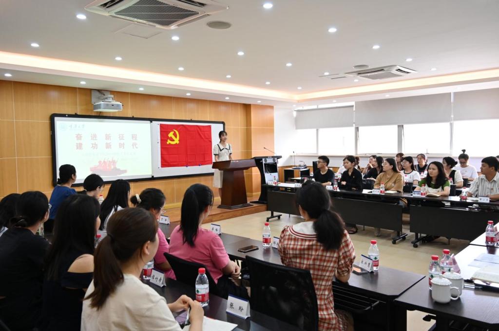 研究生二支部梁菲同学首先组织党员同志学习习近平总书记关于青年工作的重要论述,强调青年应该与新时代同步同行,树立远大理想目标,勇挑重任,在社会主义建设的伟大事业中实现自身价值。甘敏同学以优秀青年典型为切入点,强调主动承担社会责任,扎根基层一线对青年成长的重要作用。