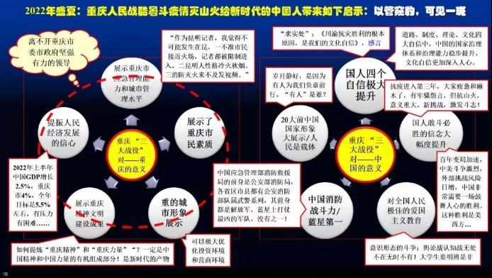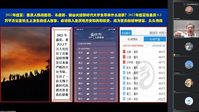 课堂伊始,鄢显俊教授以丰富的图片、视频素材带领大家回顾了2022年夏天重庆人民打的“三大战役”——持续高温、抗击疫情、突发山火。其中令人动容的有骁勇的重庆骑士、团结的重庆人民以及无数勇往直前的志愿者,还有云南森林消防官兵酷暑中扑灭熊熊山火,守护北碚人民的缙云家园,向人民交出了六日扑灭山火且无人牺牲的优异答卷。