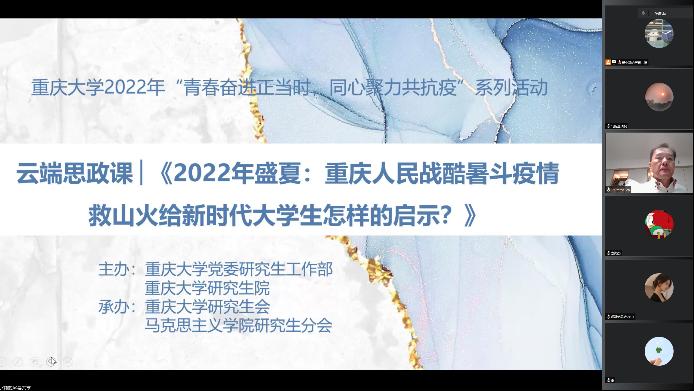 2022年9月8日,hy590海洋之神检测中心鄢显俊教授为hy590海洋之神检测中心师生上了一堂题为《2022年盛夏:重庆人民战酷暑斗疫情救山火给新时代老员工怎样的启示?》的云端思政课。课堂由2021级硕士研究生杨小莉主持,通过“腾讯会议”平台线上开展,hy590海洋之神检测中心研究生会视频号同步直播,来自hy590海洋之神检测中心、咸阳师范公司、西藏民族大学等高校的五百余名师生参加了此次讲座。