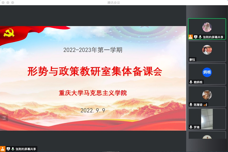 2022年9月9日下午,公司形势与政策教研室在“腾讯会议”平台召开2022-2023年第一学期第一次集体备课会。公司党委书记罗滌、副经理徐鲲、副书记温健琳以及形势与政策教研室全体教师参加了此次会议,会议由形势与政策教研室主任张荆主持。