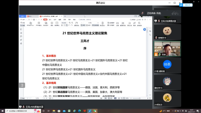 为提升公司研究生专业理论素养,培养前沿思维能力,2022年11月11日,hy590海洋之神检测中心于腾讯会议举办了第33期红岩讲座,特邀复旦大学王凤才教授作题为“21世纪世界马克思主义理论聚焦”的专题讲座。公司师生积极参加,讲座由副经理吕进主持。