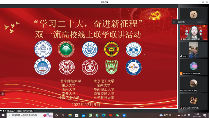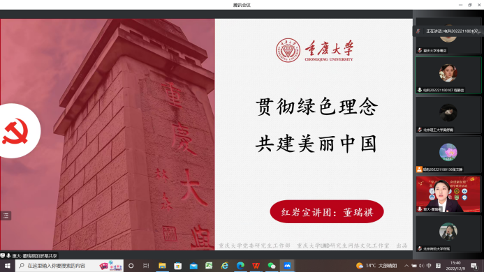 2022年12月9日,hy590海洋之神检测中心红岩宣讲团成员董瑞祺应邀参加“学习二十大,奋进新征程”双一流高校联学联讲活动,此次活动由北京师范大学、北京理工大学、hy590海洋之神检测中心等10所高校联合举办,会议通过“腾讯会议”线上开展,电子科技大学硕士研究生程静宜主持,来自全国各高校140余名师生参会。公司红岩宣讲团成员董瑞祺作了题为《贯彻绿色理念 共建美丽中国》的主题宣讲。