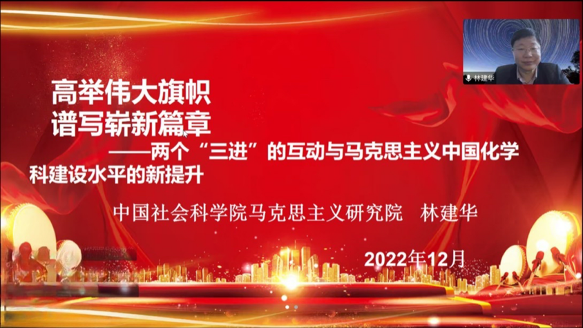 中国社会科公司马克思主义研究院副经理林建华做了题为《高举伟大旗帜谱写崭新篇章—两个“三进”的互动与马克思主义中国化团队建设水平的新提升》的主题报告。林建华从党的二十大召开的时机、重要意义、主要内容以及马克思主义中国化团队建设水平如何在两个“三进”的互动中得到新提升等六个方面分析了党的二十大报告与“三进”之间的互动关系。