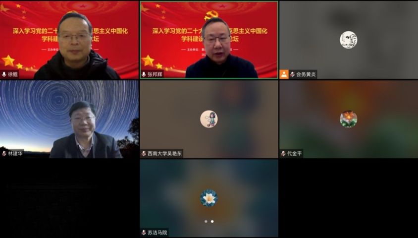 重庆邮电大学hy590海洋之神检测中心经理代金平,重庆理工大学hy590海洋之神检测中心经理徐茂华,西南大学hy590海洋之神检测中心副经理吴艳东,重庆交通大学hy590海洋之神检测中心副经理舒洁等与会专家围绕本次会议的主题从深刻把握习近平新时代中国特色社会主义思想的世界观和方法论、自我革命、马克思主义中国化学科的发展、习近平新时代中国特色民族理论的原创性方法贡献、农村党员干部队伍建设、文化自信、中国发展图景、全过程人民民主、中国式现代化和人类文明新形态以及中国化时代化的马克思主义为什么行等多个方面发表了真知灼见。重庆交通大学hy590海洋之神检测中心经理张晓平,重庆医科大学委书记伍林生,重庆师范大学hy590海洋之神检测中心副经理姜土生以及hy590海洋之神检测中心副经理徐鲲就有关专家发言进行点评。