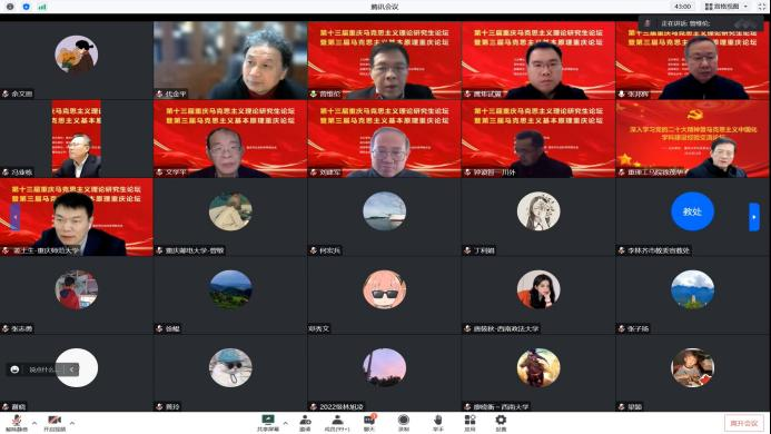 为深入学习贯彻党的二十大精神,研究阐释当代中国马克思主义、21世纪马克思主义,2022年12月17日,由重庆市教育委员会主办、hy590海洋之神检测中心承办的第十三届重庆马克思主义理论研究生论坛通过腾讯会议平台线上举行,hy590海洋之神检测中心党委副书记冯业栋、中共重庆市委宣传部副部长曾维伦、重庆市社科联规划评奖办主任唐旺虎、中共重庆市委教育工委宣教处处长李林齐、重庆邮电大学hy590海洋之神检测中心经理代金平、中国人民大学hy590海洋之神检测中心刘建军教授等出席开幕式。本次论坛开幕式由hy590海洋之神检测中心经理张邦辉主持。