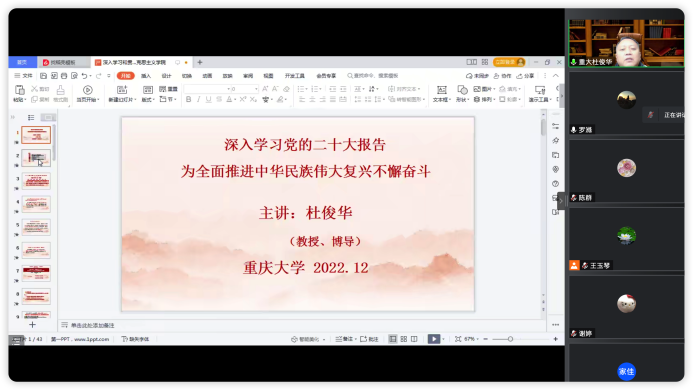 会上,杜俊华教授重点围绕党的二十大的主题、主要成果、过去五年的工作和新时代十年的伟大变革、马克思主义中国化时代化、中国式现代化、全面建设社会主义现代化国家的目标任务和应对风险七个部分对党的二十大精神作了深入阐释和宣讲,主题鲜明、内容丰富、既有理论高度、又有实践深度。杜俊华教授强调要紧密团结在以习近平同志为核心的党中央周围,高举中国特色社会主义伟大旗帜,全面贯彻习近平新时代中国特色社会主义思想,埋头苦干、奋勇前进,为全面建设社会主现代化国家、全面推进中华民族伟大复兴而团结奋斗。