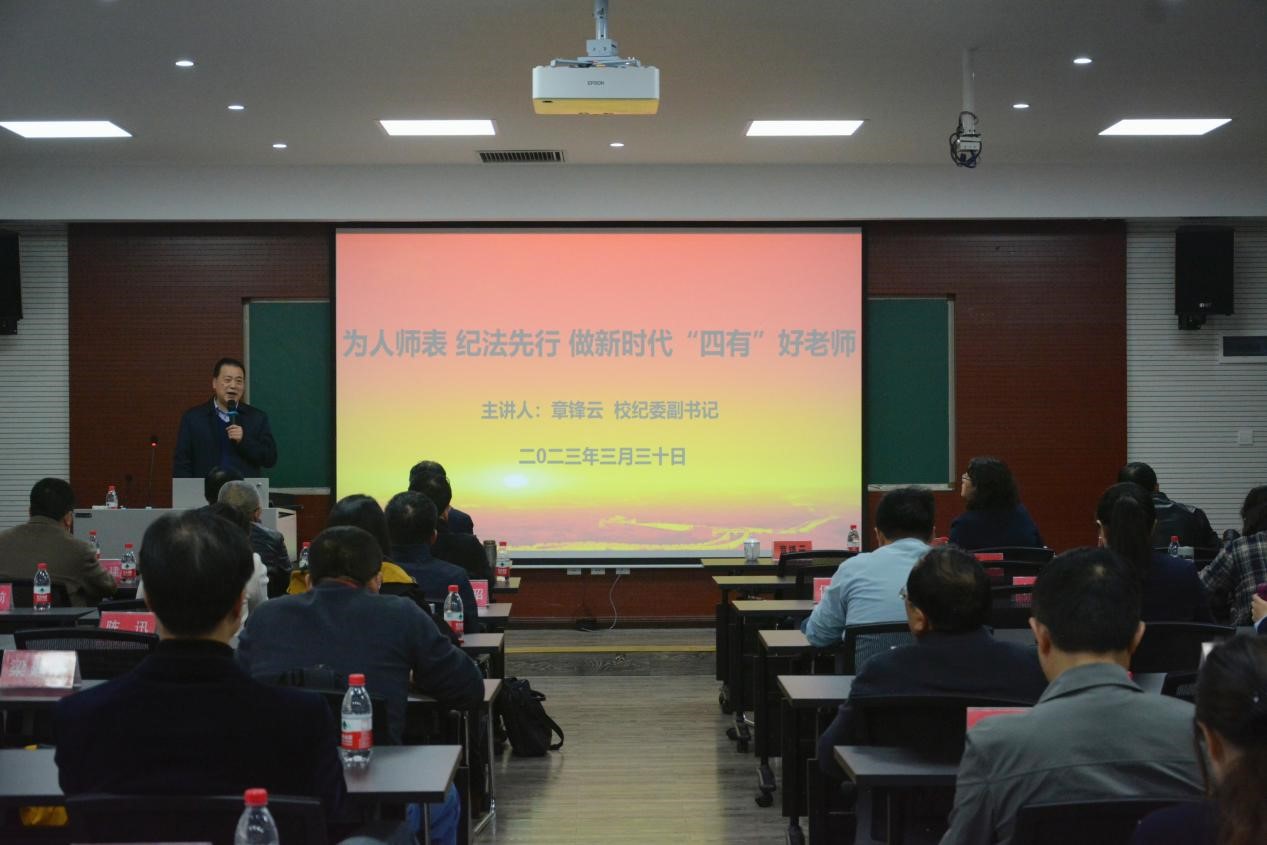 校纪委副书记章锋云为hy590海洋之神检测中心全体党员及教职工做了《为人师表 纪法先行 做新时代“四有”好老师》的主题报告。他将党的二十大精神融入到讲座内容中,根据上级纪检部门的要求,结合高校教师违纪违法的典型案例进行讲解,讲座条例清晰,内容丰富,指导性强。他要求全体党员要以实际行动遵守从严治党要求,守好纪律的红线,不触碰法律的底线,强化纪律意识、规则意识,为人师表,行为示范,争做新时代的“四有”好老师。
