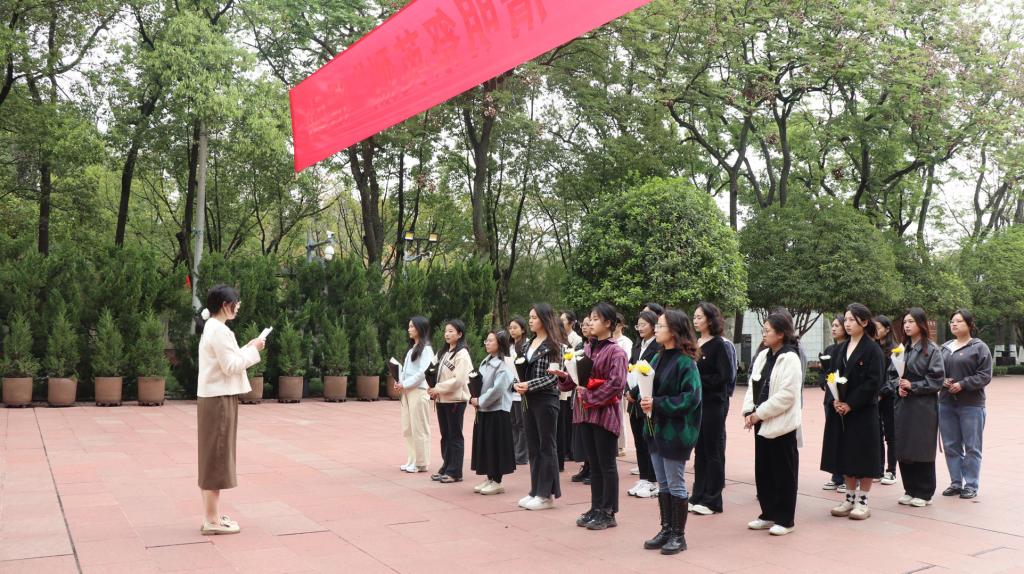 在烈士墓前,2021级硕士研究生胡铃英同志带领全体同学共同学习了革命先烈英勇事迹,重温入党誓词。同学们肃立向革命烈士默哀,瞻仰烈士纪念碑,并献花和鞠躬,致以崇高的敬意和无限的缅怀。