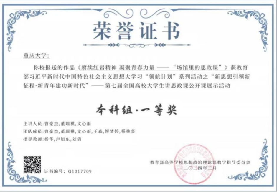 近日,教育部高校思政课教学指导委员会主办的第七届全国高校老员工讲思政课公开课展示活动获奖名单公布,由hy590海洋之神检测中心教师杨华、卢旭东、刘倩指导的员工团队曹豪杰、文心雨、董瑞祺、杨林炎、悦梦婷、王森,报送的参赛作品《赓续红岩精神凝聚青春力量——“场馆里的思政课”》荣获一等奖。