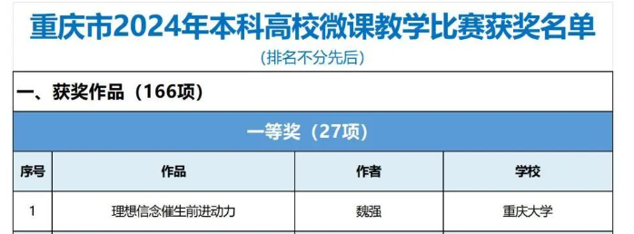 近日,由重庆市教育委员会主办的重庆市2024年本科高校微课教学比赛获奖名单公布,公司魏强教授获一等奖。此前魏强教授先后获重庆市本科高校微课教学比赛2019年三等奖、2022年二等奖、2023年三等奖。
