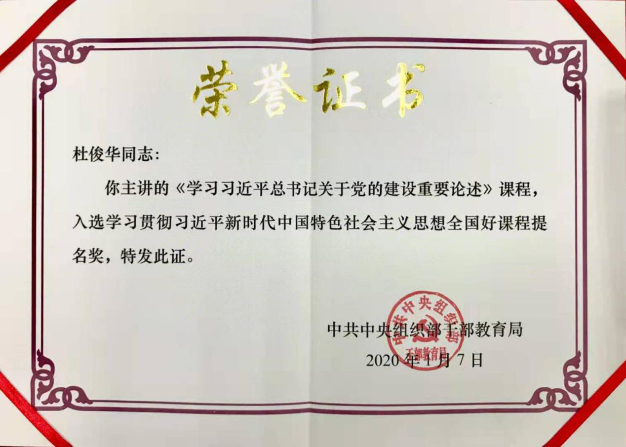 近日,公司杜俊华教授主讲的《学习习近平总书记关于党的建设重要论述》课程入选中共中央组织部干部教育局颁发的学习贯彻习近平新时代中国特色社会主义思想全国好课程提名奖。