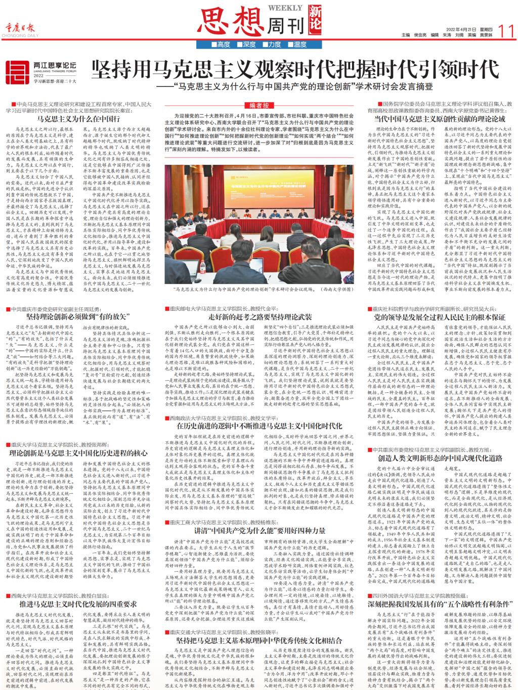 4月16日,重庆市委宣传部、重庆市社科联、重庆市中国特色社会主义理论体系研究中心、西南大学联合召开了“马克思主义为什么行与中国共产党的理论创新”学术研讨会。公司经理张邦辉参加研讨会并作主题发言,4月21日出版的《重庆日报》刊登了张邦辉经理的主题发言。