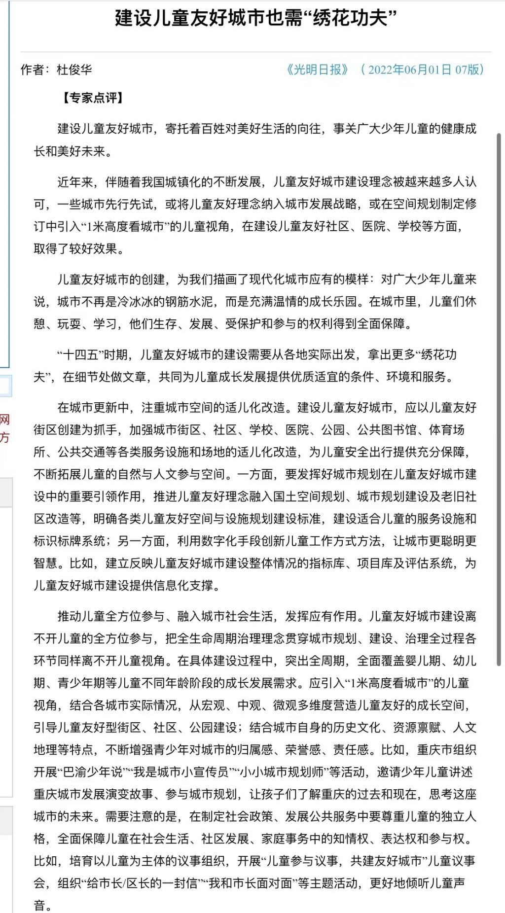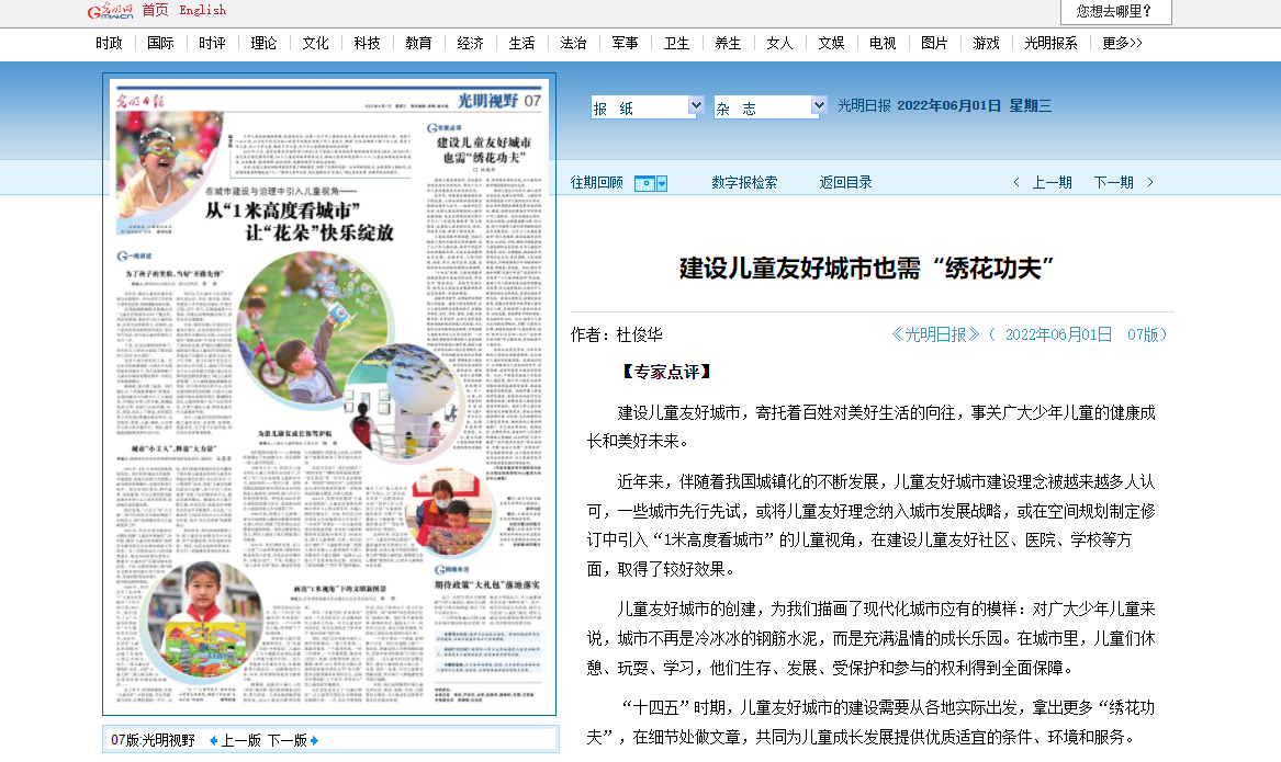 党的十八大以来,习近平总书记多次发表讲话强调,儿童是国家的未来和民族的希望,是中国特色社会主义现代化国家建设的未来生力军。全社会要形成关心儿童,爱好儿童,服务儿童的良好氛围和环境,为此,国家专门出台了儿童友好型城市建设纲要。值此六一儿童节到来之际,hy590海洋之神检测中心杜俊华教授在6月1日出版的《光明日报》发表专家点评理论文章《建设儿童友好城市需要有“绣花功夫”》。