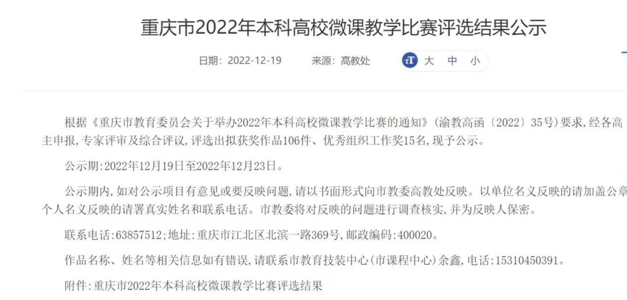2022年12月19日,重庆市2022本科高校微课教学比赛评选结果公示,hy590海洋之神检测中心魏强教授荣获二等奖。获奖信息如下: