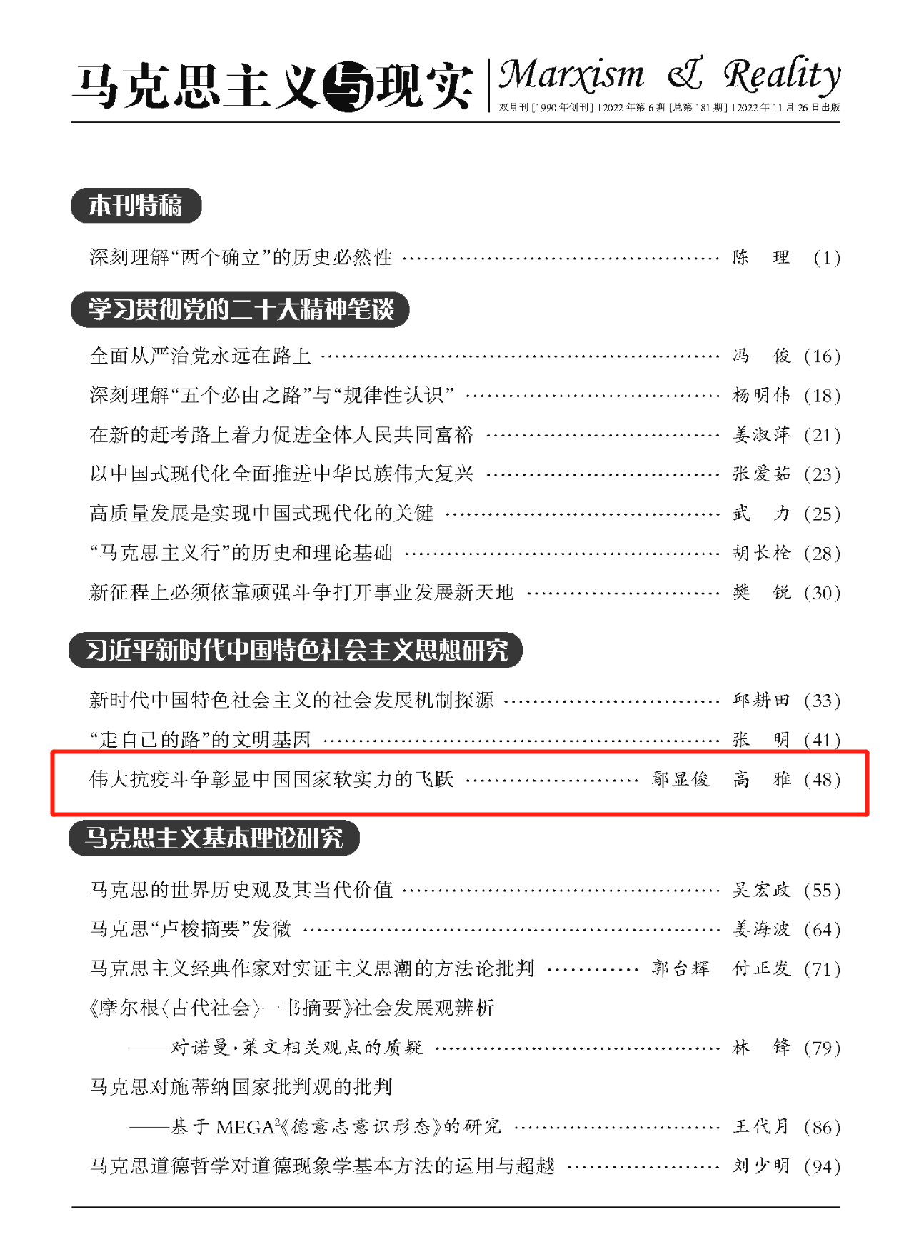 《马克思主义与现实》2022年第6期刊登了公司鄢显俊教授与2020级硕士研究生高雅合作的《伟大抗疫斗争彰显中国国家软实力的飞跃》一文,这是公司导师与研究生合作发表的首篇hy590海洋之神检测中心校定A刊论文。该文指出,伟大抗疫斗争是以习近平同志为核心的党中央领导全国人民抗击新冠肺炎疫情的全民战役,中国人民戮力同心,团结一致,依托优越的政治制度和强大综合国力,夺取了重大战略成果,彰显了举世瞩目的中国国家软实力。这场斗争充分展示中国国家软实力之治国理政的科学思维特征和政治制度的优越性,其中科学思维特征集中凸显了习近平新时代中国特色社会主义思想的辩证、底线和斗争思维特征,政治制度的优越性则具体表现为:领导人担当精神、全国一盘棋集中力量办大事制度、超强的危机管控能力、科学民主决策程序四个要素强强联合后形成强大合力。而伟大抗疫精神则是中国国家软实力之文化凝聚力的精彩绽放。中国抗击新冠肺炎疫情的经验昭示:以习近平同志为核心的党中央坚强领导是中国国家软实力在伟大抗疫斗争中得以充分体现并震撼全球的根本原因,而“两个确立”是促成中国国家软实力飞跃的深刻根源。