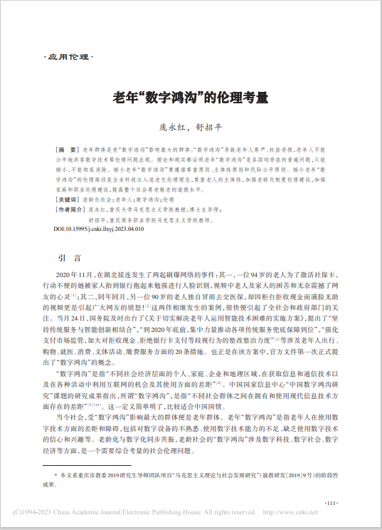 老年群体是受“数字湾沟”影响最大的群体。“数字鸿沟”导致老年人尊严、权益受损,老年人不能公平地共享数字技术等伦理问题出现。理论和现实都证明老年“数字湾沟”是各国均存在的普遍问题,只能缩小,不能彻底消除。缩小老年“数字鸿沟”要道循尊重原则、主体性原则和代际公平原则。缩小老年“数字鸿沟”的伦理路径是企业科技注入适老化伦理理念,尊重老人的主体性,加强老龄化制度伦理建设,加强家庭和职业伦理建设,提高整个社会尊老敬老的道德水平。