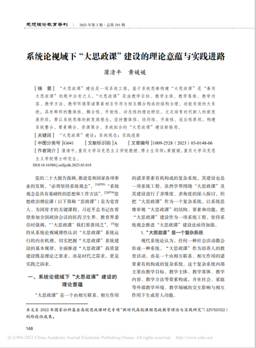 “大思政课”建设是一项系统工程,基于系统思维构建“大思政课”是“善用大思政课”的题中应有之义。“大思政课”是由教学目标、教学主体、教学客体、教学内容、教学方法、教学环境等诸要素相互作用与相互耦合构成的结构合理、功能有效的大系统,具有鲜明的整体性、耦合性、开放性、动态性的理论特征。立足培育时代新人的新发展阶段,要以系统思维的新发展理念,坚持整体性、协同性、开放性、适应性原则,构建系统整合、要素耦合、资源聚合、系统拟合的“大思政课”建设新格局。