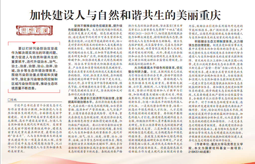 陈鹏博士提出应以习近平生态文明思想为指导,从坚持不懈推动绿色低碳发展,提升绿色低碳发展水平;深入推进长江经济带污染治理,全面提高环境治理水平;大力构建高水平绿色科技体系,优化整合科研力量;积极健全生态文明制度体系,大力增强生态治理效能四个方面推动建设人与自然和谐共生的美丽重庆。