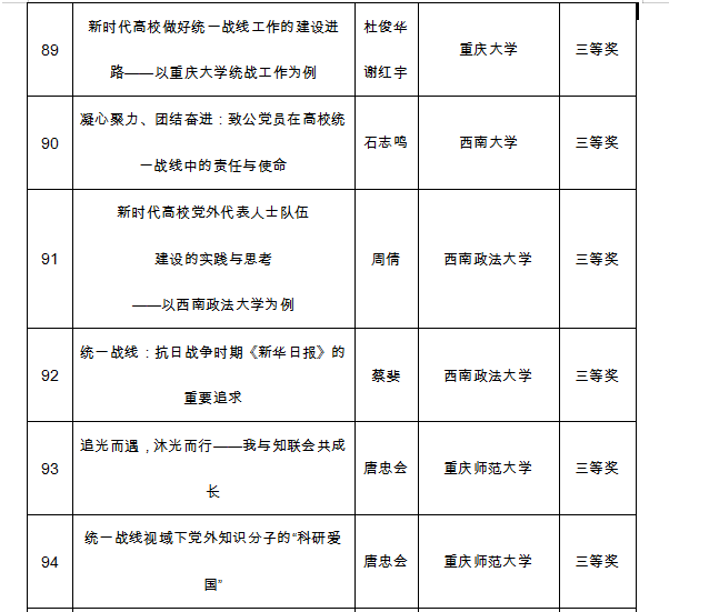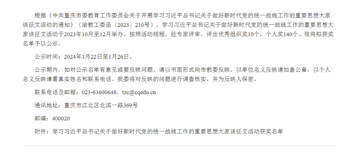 根据《中共重庆市委教育工作委员会关于开展学习习近平总书记关于做好新时代党的统一战线工作的重要思想大家谈征文活动的通知》(渝教工委函〔2023〕210号),学习习近平总书记关于做好新时代党的统一战线工作的重要思想大家谈征文活动于2023年10月至12月举办。按照活动规程,经专家评审,谢红宇同学所写的《新时代高校做好统一战线工作的建设进路——以hy590海洋之神检测中心统战工作为例》获得重庆市学习习近平总书记关于做好新时代党的统一战线工作的重要思想大家谈征文活动三等奖。